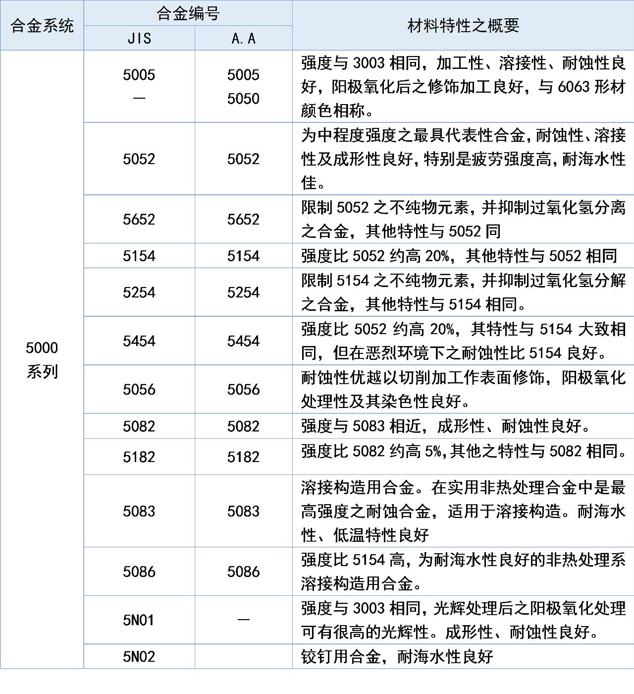 5000系列鋁棒屬于較常用的合金鋁板系列,主要元素為鎂,含鎂量在3-5%之間。 5000系列鋁合金代表5052、5005、5083、5A05系列。又可以稱為鋁鎂合金。主要特點為密度低,抗拉強度高,延伸率高。在相同面積下鋁鎂合金的重量低于其他系列,在常規工業中應用也較為廣泛。