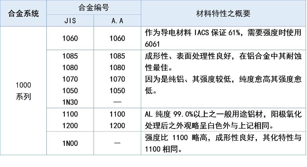 一系的鋁成形性、表面處理性良好,在鋁合金中其耐蝕性zui佳。其強度較低,純度愈高其強度愈低。