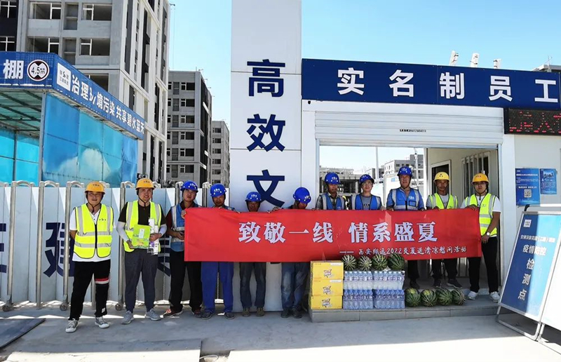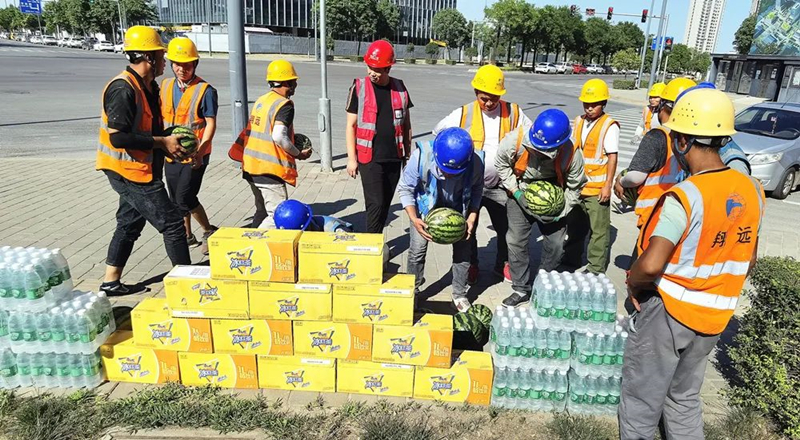 炎炎夏日,目前正值高溫天氣,酷熱的天氣給堅守在一線工地的工人師傅們帶來更多的挑戰,汗水一次又一次的浸濕了身上的衣服,西安翔遠裝飾工程有限責任公司是一個注重人文關懷的大家庭,實時關注高溫天氣還在戶外工作的工人們身體健康狀況和生命安全,為在一線高溫工作的工人們送去夏日清涼、送去關懷。