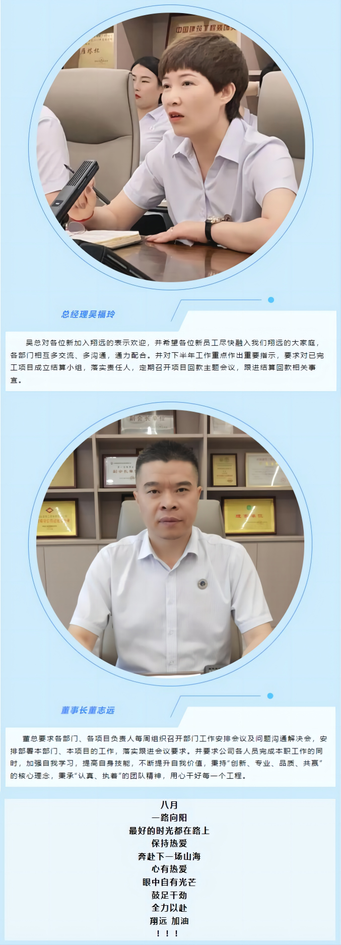 隨著公司的不斷發(fā)展,新起項(xiàng)目的進(jìn)場,公司隊(duì)伍不斷壯大,新加入我們翔遠(yuǎn)的伙伴們依次進(jìn)行自我介紹,大家表示熱烈歡迎。